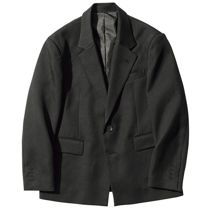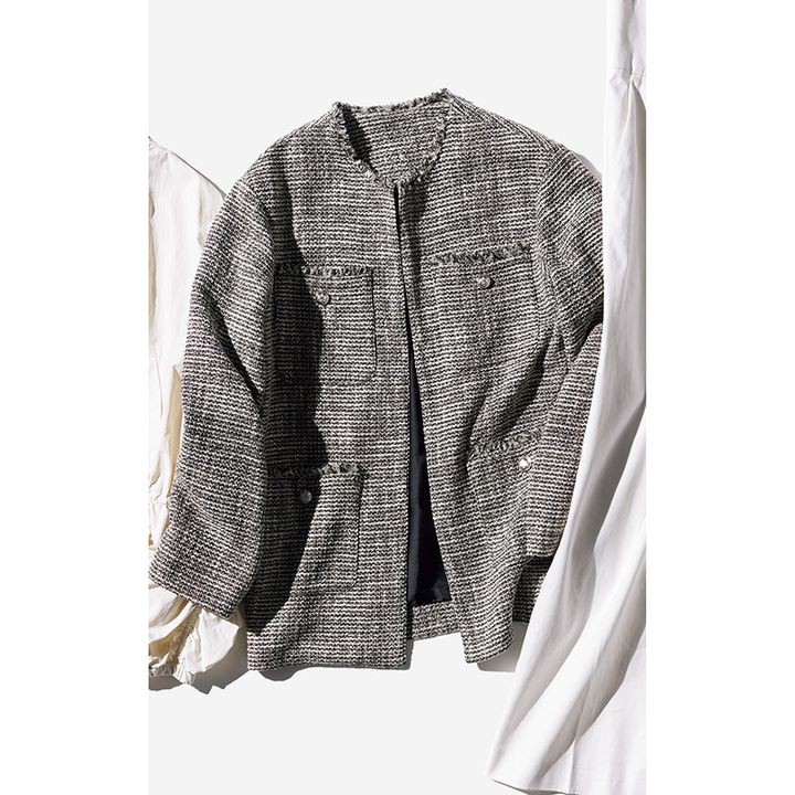 無駄のない洗練デザイン。メンズ風のオーバーサイズシルエットだから重ね着もしやすい。 ジャケット¥24,200(ムウ ト アール)