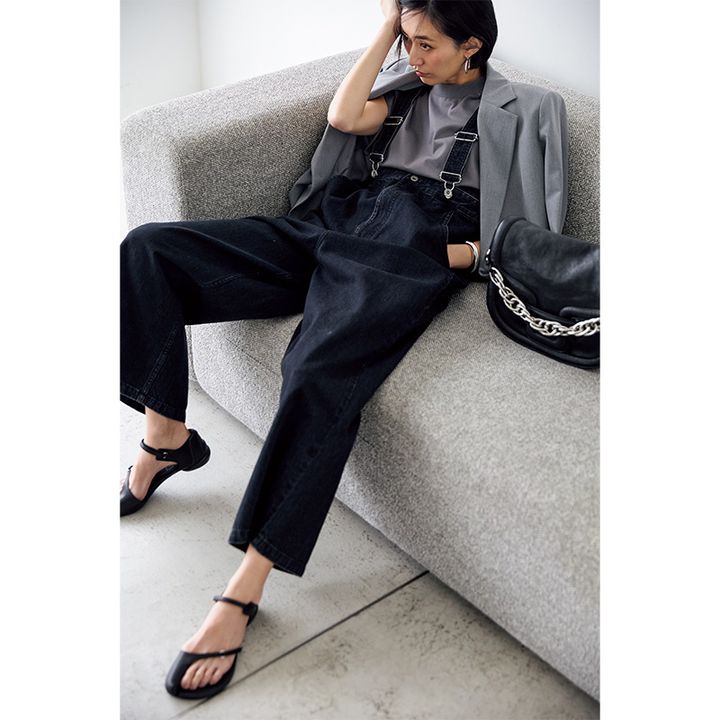 オーバーオール¥20,900(オー・ゼロ・ユー/アダストリア)カットソー¥17,600(ハイク/ボウルズ)ジャケット¥31,900(カデュネ)ピアス¥11,000(ワンエーアールバイウノアエレ/ウノアエレ ジャパン)バングル¥13,750(エイチアッシュ/フォーティーン ショールーム)バッグ¥227,700(ピエール アルディ/ピエールアルディ 東京)サンダル¥29,700(シーセイ/アイネックス)