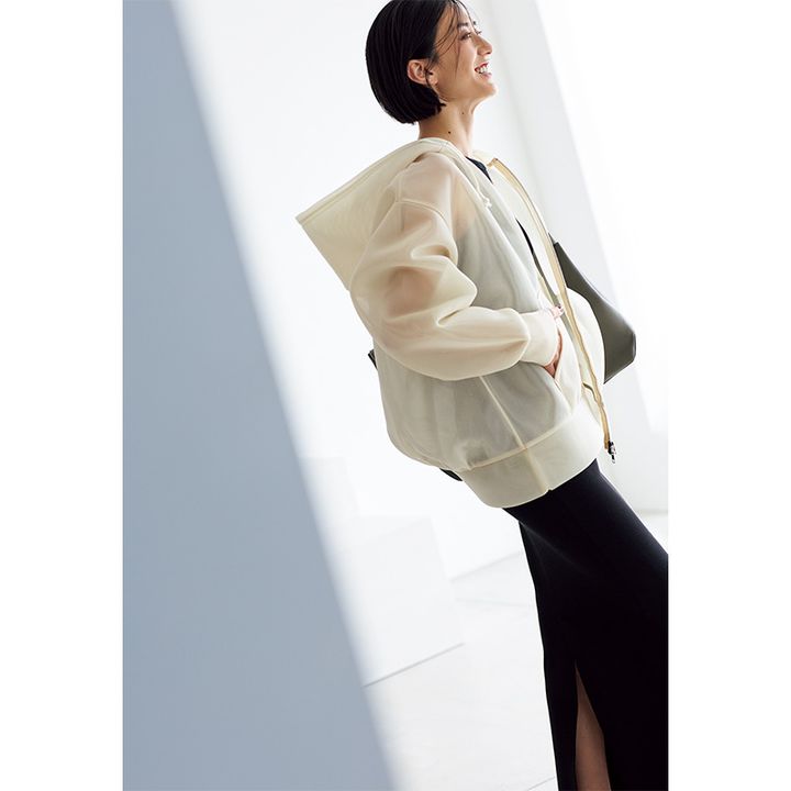 yuw [ユウ] 立体的な透けパーカで いつもの黒コーデも更新感!