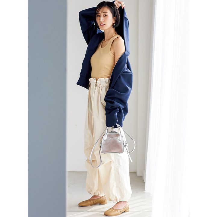 パーカ¥13,200(yuw/アダストリア)タンクトップ¥13,200(ボーダーズ アット バルコニー)スカート¥35,200(カオス/カオス丸の内)バッグ¥89,100(FARO/BRIEFING 丸ビル店)