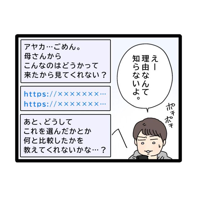「アヤカ・・ごめん。母さんから、こんなのはどうかって来たから見てくれない?あと、どうしてこれを選んだとか、何と比較したかを教えてくれないかな・・?」