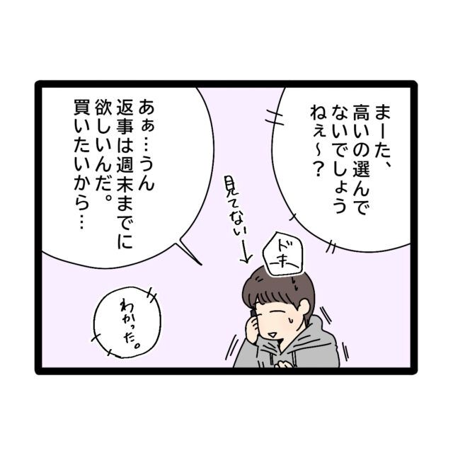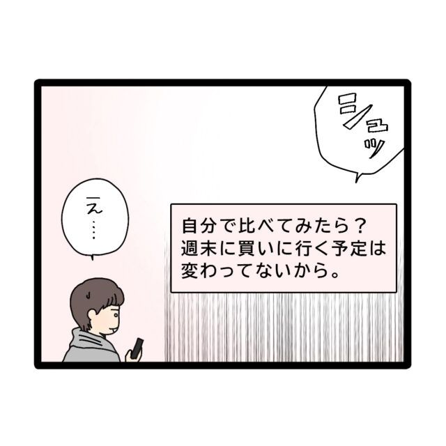 「自分で比べてみたら?週末に買いに行く予定は変わってないから」
