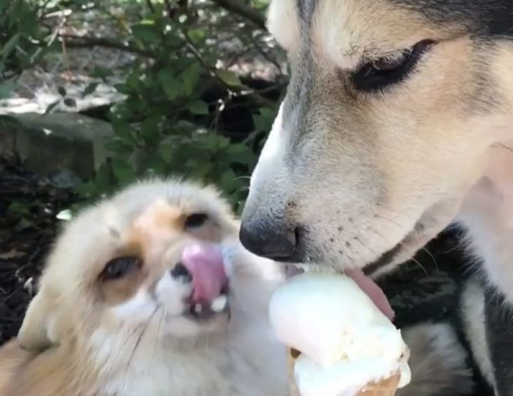 3. アイスを分け合うほど仲良し!一緒に暮らす犬とキツネ。