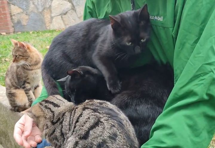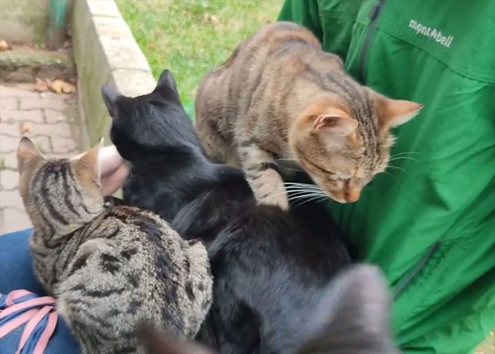 ヒザの上をはじめ、確認できるだけでも周囲には5匹の猫の姿が確認できます。