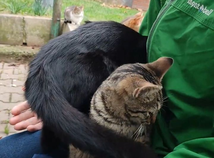 その後、黒猫がどこかへ行くと、すぐそばにいた猫が待っていましたとばかりにヒザの上へ乗っかってきました。 これで『ヒザねこトリプル』の完成です!