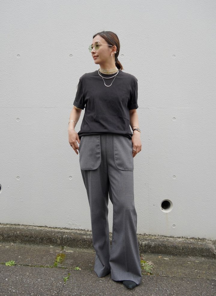 「シンプルになりがちな無地Tシャツとスラックスのワンツーコーデは、Tシャツの中にイエローのシアートップスをレイヤードして、モノトーンスタイルにさり気なくニュアンスをプラス。ジュエリーやサングラスなどソリッドな質感の小物使いでアクセントにしました」
