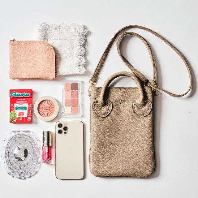スマホ以外にも、財布やハンカチも入る、ちょっと大きめサイズ。