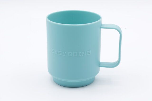 今回ご紹介するのは『PPマグカップ EG 300ml』という商品です。くすんだブルーの色合いや、ロゴが浮き出たデザインが特徴的。