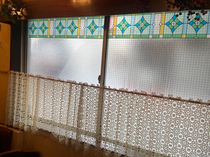 こういうカーテンのことをカフェカーテンと呼ぶことすら最近知った筆者ですが、カーテンも窓ガラスの装飾も昭和レトロ感満載。