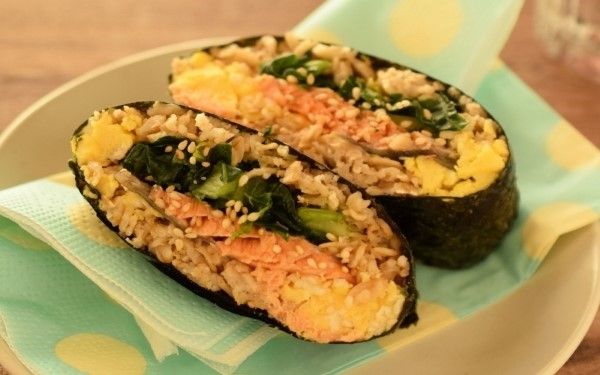 オートミールはお弁当でも大活躍! 海苔と合わせるとお米感がアップしますね。焼き鮭、小松菜、炒り卵などを合わせ、彩り鮮やかで栄養満点です。ラップでしっかりと巻いてから濡らした包丁で半分に切ると、断面がキレイに仕上がりますよ。