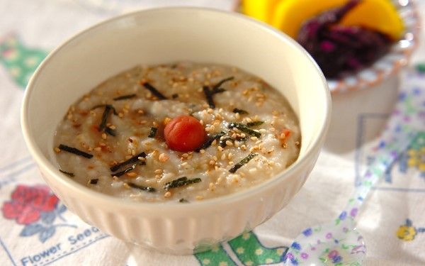 市販のお茶漬けの素を入れてひと混ぜするだけの簡単オートミール粥です。和食に近い感覚で食べられるので、オートミール初挑戦の方でも食べやすいでしょう。5分程度でパパッと作れて、小腹が空いたときにもおすすめです。