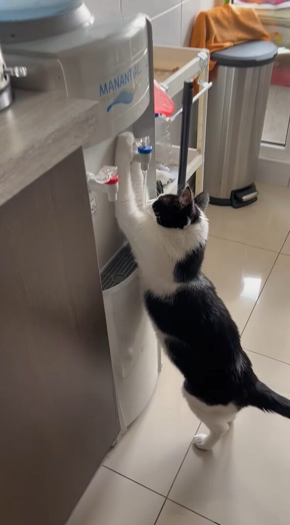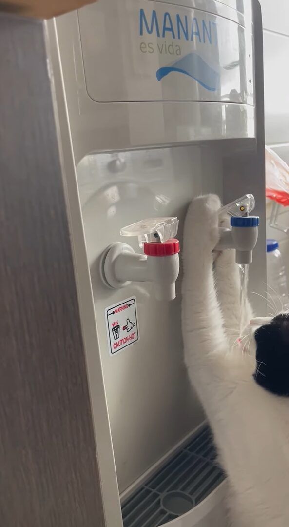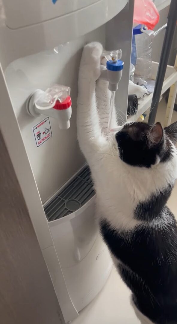 水を飲むのがとても得意な猫。 おててでウォーターサーバーのレバーを器用に操作して、上手に水を飲んでいます!!