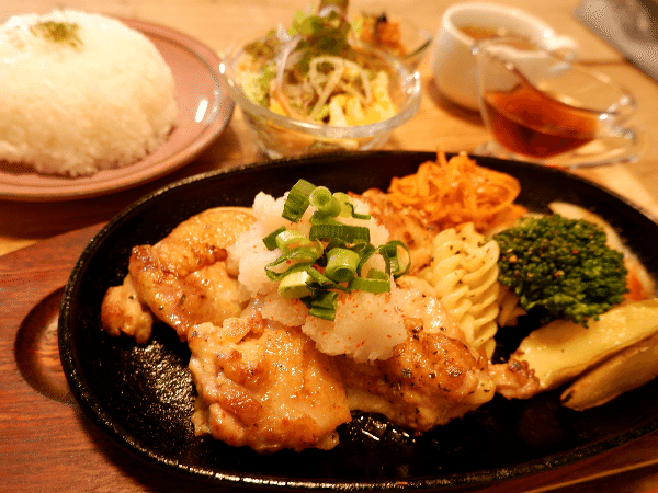鉄板チキングリルは、以前からあるメニューのひとつですが「ポン酢ソース&梅みぞれ」が新作なんです。梅みぞれがのったチキンに、オデヲン自家製のポン酢をかけていただきます。