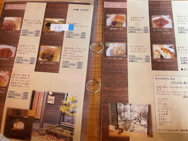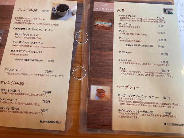お食事メニューはカレーライスやオムライスなどがそろっています。甘味類メニューには、ケーキはもちろんのこと、パフェやワッフルまで。おもちやおしるこなどの和風甘味もあります。珈琲から紅茶のみならず、ドリンク類も充実しています。