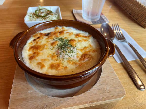 えびドリアのよくばりセットなるものを注文。よくばりセットはメインとドリンクとケーキがセットになったもの。メインによって、それぞれ値段は異なりますが、選んだえびドリアだと2,060円。ぐつぐつ熱々で優しい味のドリア。大きなえびが入っています。