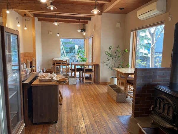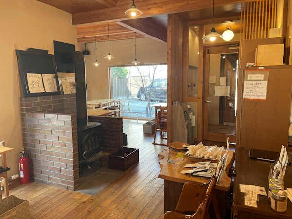 梁などをむき出しのままに、木がふんだんに使われた内装で温かいぬくもりが感じられます。中央には薪ストーブが設置され、癒し感を醸し出しています。