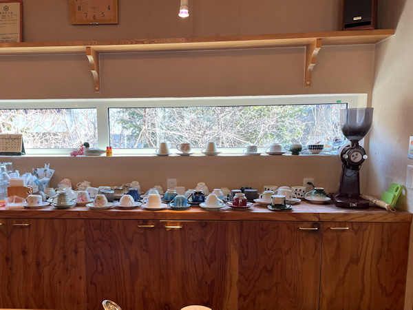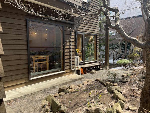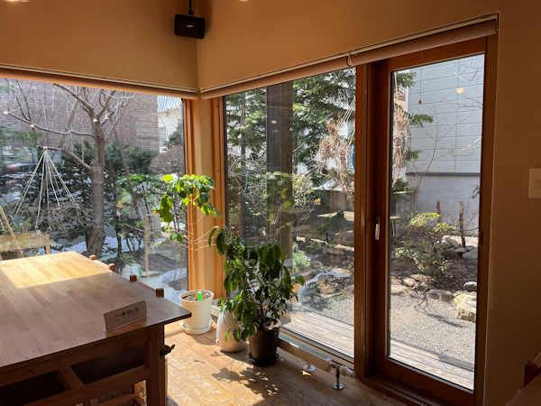 庭には、桜やツツジ等の季節ごとの花が楽しめる木々が植えられています。訪ねた時は、雪解けの時期。これからは庭の緑を眺めながら、食事や甘味を楽しめそうです。庭に向かったカウンター席もあります!