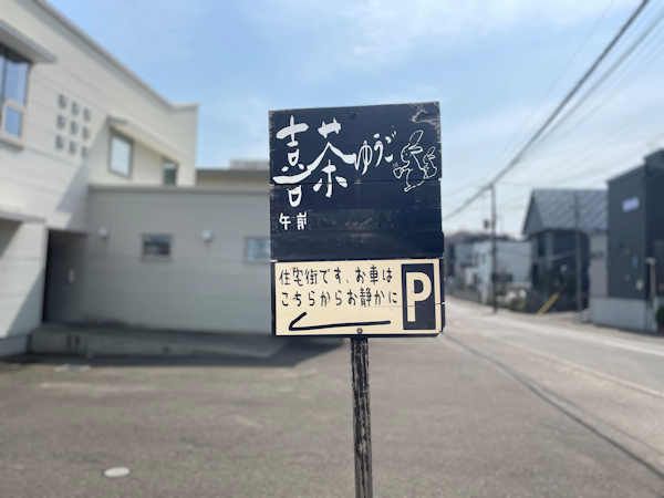 高低差のある住宅街の突き当たりに位置する「喜茶 ゆうご」さん。お店の場所を知らなければ、なかなかたどり着けないかな?この看板を見つけるとスムーズです(苦笑)