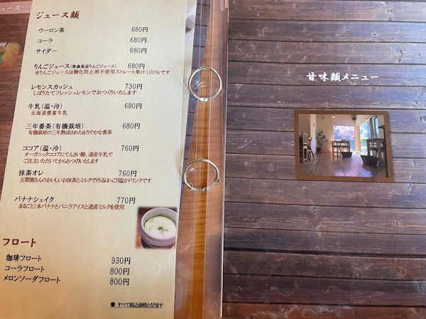 甘味類メニュー。ケーキはロールケーキなど7-8種類ほど用意されるそうです。素材にこだわって、直接農家さんから仕入れているとのこと。道産の小麦やバター、そして有精卵を使用しています。