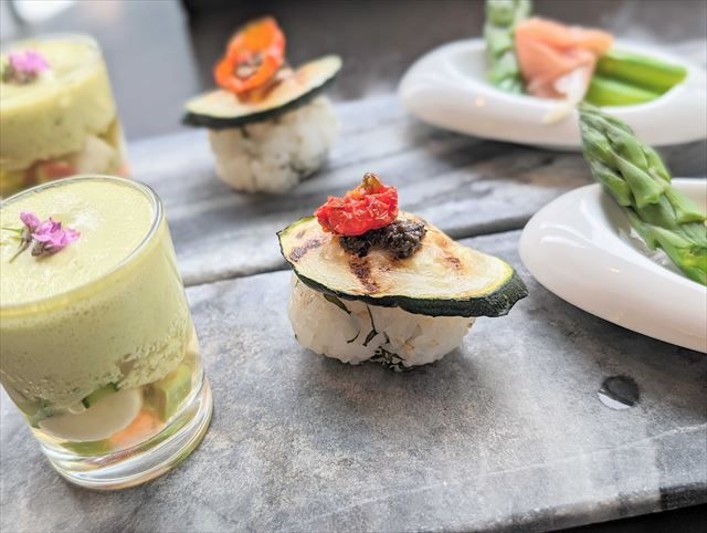 お気に入りは「ズッキーニの手まり寿司」。ガリ、ゴマ、大葉の和風なシャリに、タップナードドライトマトとズッキーニの洋風な味わいが相性抜群で、まさに「和洋折衷」な一品でした。