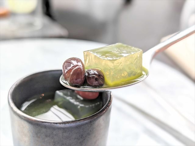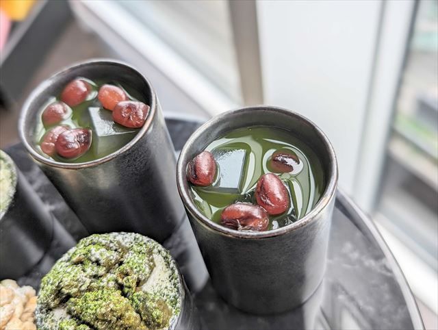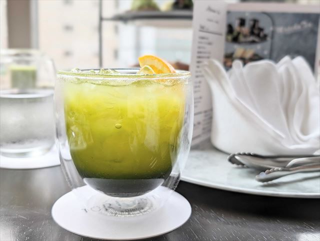 飲むとジュースの甘酸っぱさが感じられ、後味に抹茶の渋みを感じました。抹茶の渋みがあることで、後味あっさりと飲むことができ、スムーズに食事に移ることができます。