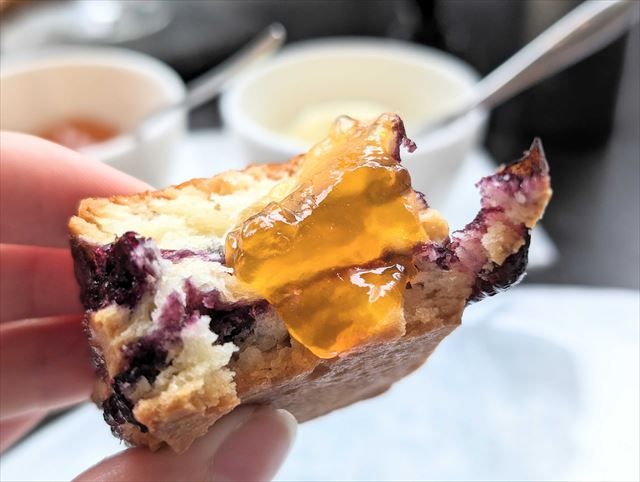 ブルーベリーのスコーンは外がサクサクで、中はしっとり。アプリコットとの相性はいかほどか…… と心配することのない抜群さ! アプリコットのしっかりとした味と甘みをスコーンが引き立ててくれます。