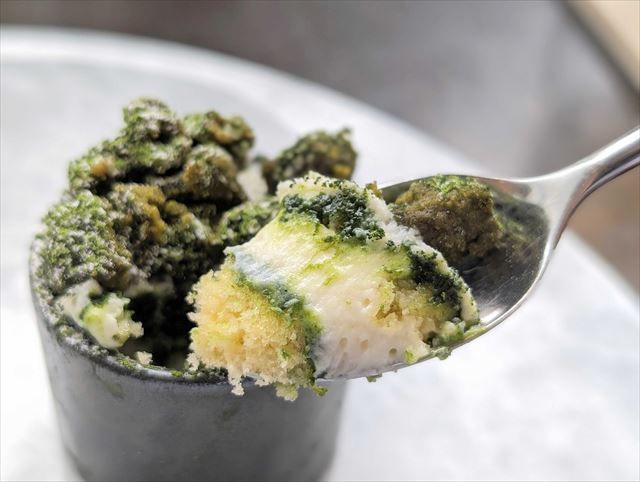 こちらのティラミスは、アーモンドプードルを使ってザクザク感を出している抹茶のクランブルが上にのっており、ふわふわのスポンジ生地となめらかなクリームと異なる食感が一度に楽しめました。抹茶の甘みも中のクリームとクランブルで変わるため、一つに複数の楽しさが詰まっています。
