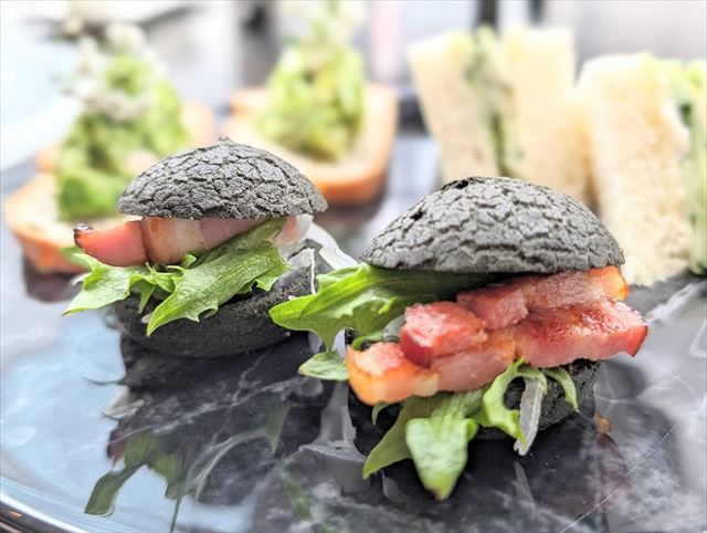 やはり気になるのは竹炭シュー! 軽いシュー生地に、ベーコン、玉ねぎ、抹茶クリームチーズがサンドされています。ベーコンの塩味や旨味がガツンと来た後に、玉ねぎのシャキシャキとした食感、抹茶クリームチーズのあっさりとした塩味、竹炭の香ばしさが香りました。