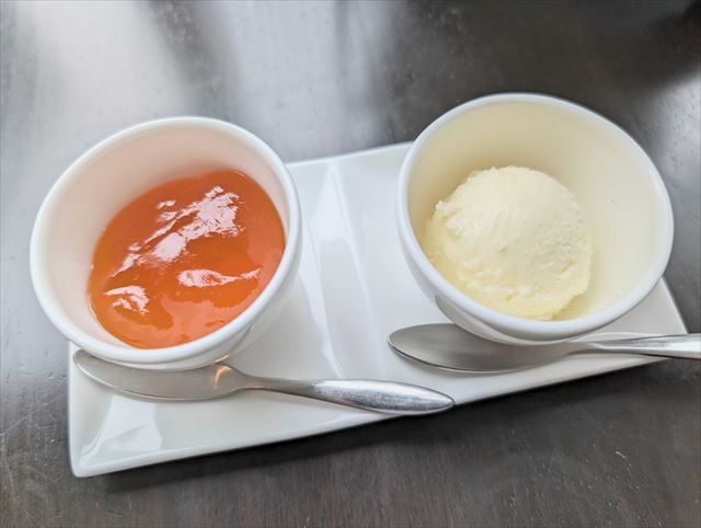「ゲランド塩」「ブルーベリー」の2種類のスコーンを、乳脂肪分が高く濃厚な味わいの「クロテッドクリーム」と、「アプリコット」をお好みで合わせて食べられます。