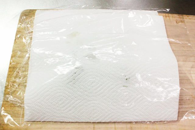 3.アボカドの上にキッチンペーパーを乗せてラップを掛け、実を潰さないように軽く丸めます。