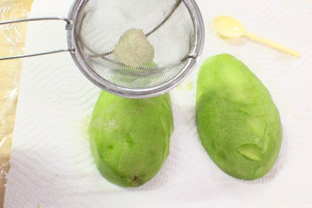 2.ラップとキッチンペーパーを敷いた上に、皮を剥いたアボカドを置き、茶こしでふるいながら昆布茶を振りかけます。
