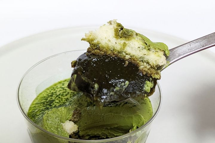 そして、外見からはわかりにくかったのですがクリームとわらび餅の間にはスポンジが入っていました。スポンジは一部抹茶シロップがしみ込んでいて、ジュワという味わいがよかったです。わらび餅は抹茶風味が濃厚でとろとろ食感! 最後のひと口まで楽しめました。