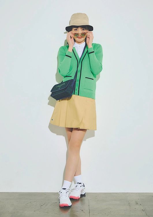 ポロシャツにパイピングカーデ、太めプリーツのミニスカで、きちんと感も遊び心もいいとこ取り。パキッとした明るいグリーンがコースで最高に映える!キャッチーな小物使いもポイント。