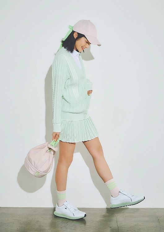 カーディガン¥24,200、ポロシャツ¥10,890、スカート¥19,800、キャップ(リボン付き)¥4,400、バッグ¥5,280、ソックス¥1,430、シューズ¥36,300(参考価格)/以上アディダスゴルフ(アディダスジャパン)