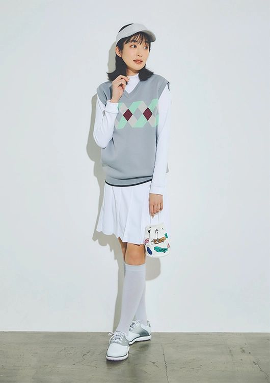 ベスト(メンズ)¥25,300、モックネックシャツ¥18,700、スカート¥23,100、サンバイザー¥8,250、ソックス¥3,080/ 以上ジュン アンド ロペ(ジュン) ポーチ¥9,350/PRG× ジュン アンド ロペ(ジュン) シューズ¥17,600(参考価格)/フットジョイ(アクシネット ジャパンインク)