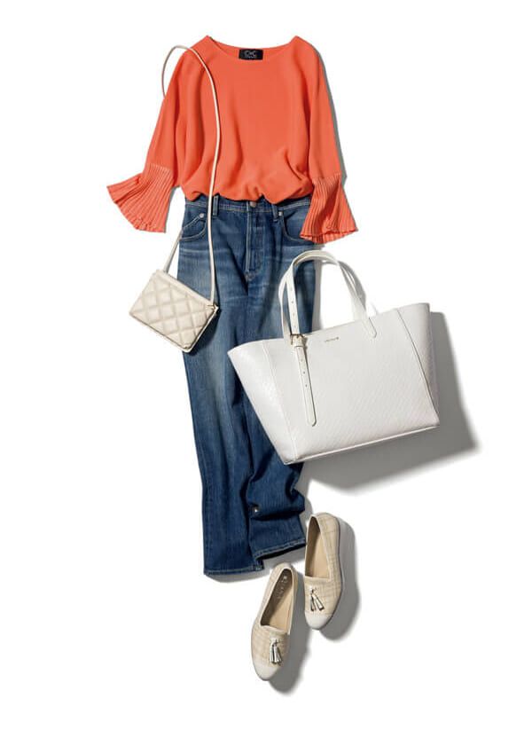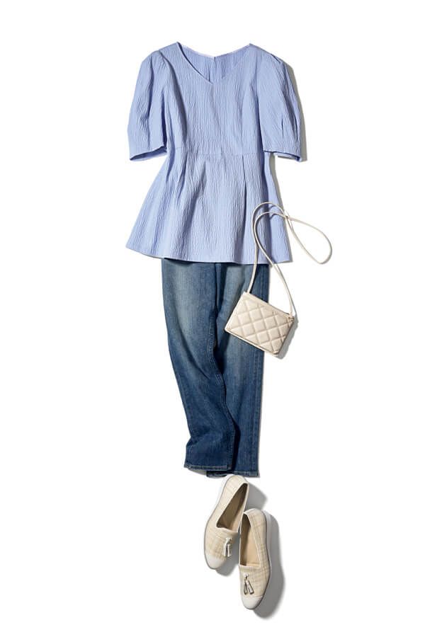 ブラウス¥17,050/クードシャンス、ショルダーバッグ¥2,858/grove(ともにワールド プレスインフォメーション) デニムパンツ¥35,200/YANUK(カイタックインターナショナル) 靴¥18,150/ダイアナ ウェルフィット(ダイアナ 銀座本店)