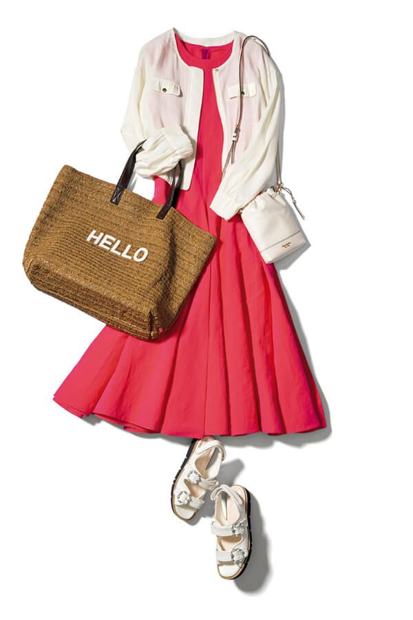 ブルゾン¥11,990/PROPORTION BODY DRESSING ワンピース¥75,900/オブリオ トートバッグ¥37,730/ニーナバッグ(ピーチ) ショルダーバッグ¥26,400/ケイト・スペード ニューヨーク(ケ イト・スペード カスタマーサービス) 靴¥18,700/ダイアナ(ダイアナ 銀座本店)