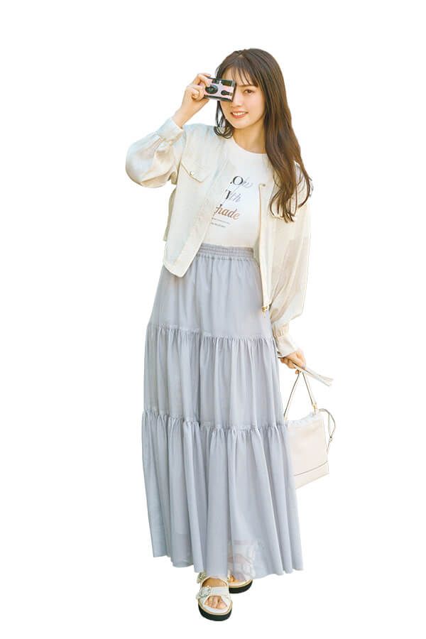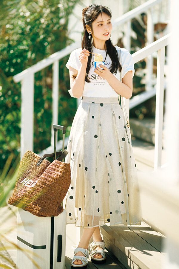 風通しがよいシアースカートは、南国でのフェミニンにうってつけ! ×ロゴTで甘スカートをラフに着こなして、リゾーティーな雰囲気に。
