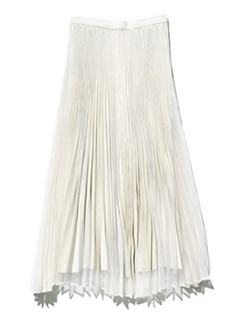 白プリーツスカート/TSURU By MARIKO OIKAWA 透明感のあるオーガンジーのプリーツが繊細な動きを拾う。長め丈のまま抜けもそこなわないよう、すそに高低差をつけた画期的なシルエット。