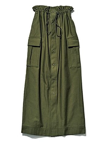 カーキスカート/SACRA(インターリブ) しっかりとしたコットンを使用した辛めな1着。穿き口のドロストによって生まれるギャザーのおかげで、ほのかにくびれをメイク。大きめのサイドポケットが太もものハリをカバー。