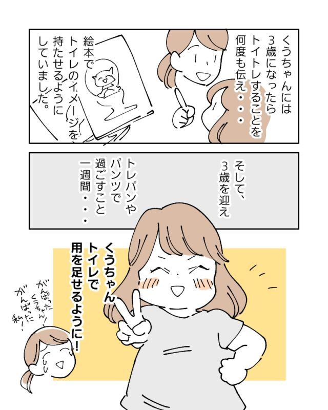 くうちゃんには3歳になったらトイトレすることを何度も伝え・・・絵本でトイレのイメージを持たせるようにしていました。