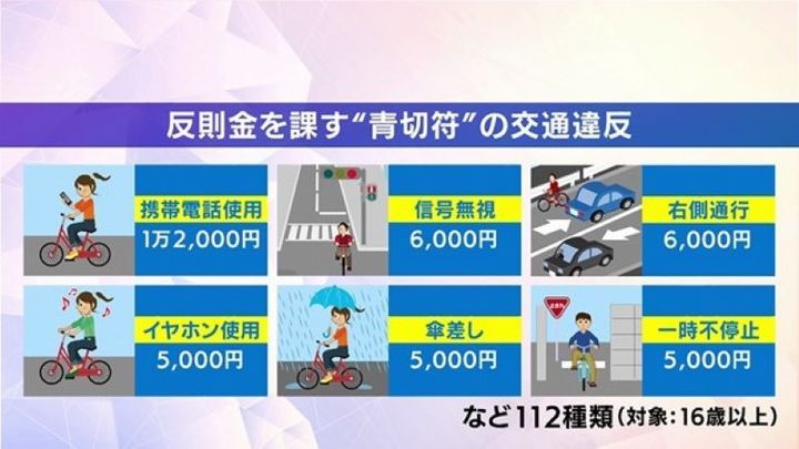 青切符の反則金を課す対象は、【携帯電話使用】で1万2000円、【信号無視】で6000円、【イヤホンの使用】で5000円、【傘をさして運転】で5000円、【一時不停止】で5000円など112種類にのぼります。