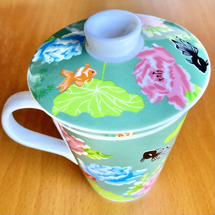 お花と金魚の柄がキュート!「茶こし付きマグカップ」
