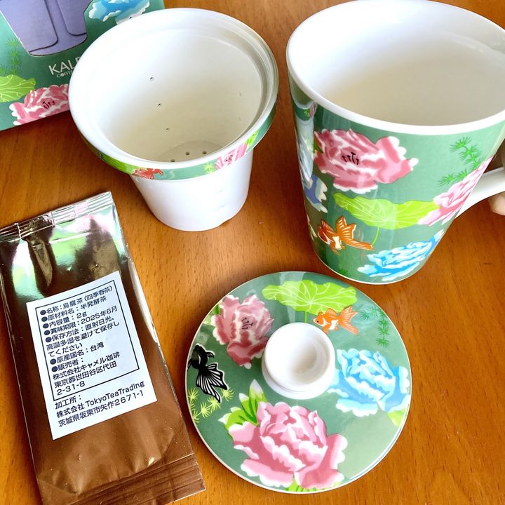 中には、茶こし・蓋がついた陶器製のマグカップと烏龍茶が入っています。茶こしの側面や蓋にも台湾伝統の客家柄(ハッカガラ)と金運のシンボル「金魚」があしらってあり、上から見ても横から見てもとってもキュート!