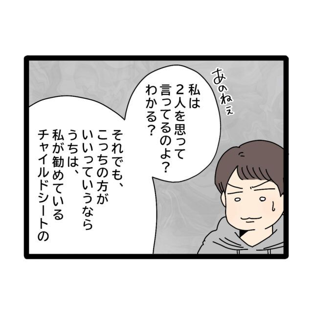 「あのねぇ、私は2人を思って言ってるのよ?わかる?それでもこっちの方がいいっていうなら、うちは私が勧めているチャイルドシートの・・」