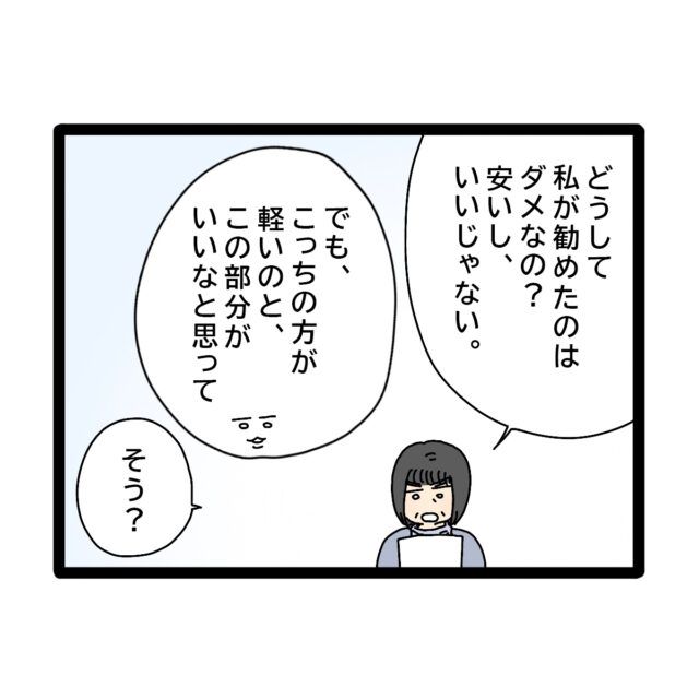 「どうして私が勧めたのはダメなの?安いし、いいじゃない」