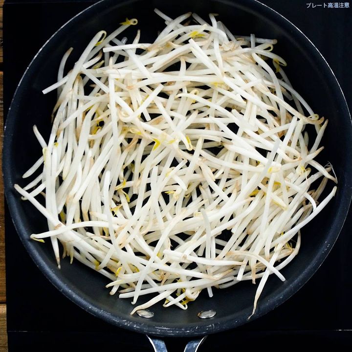 3: フライパンにもやしを敷き詰め、②をのせます。酒を加えて中火にかけ、フタをして3〜4分、豚肉にしっかりと火が入るまで加熱します。