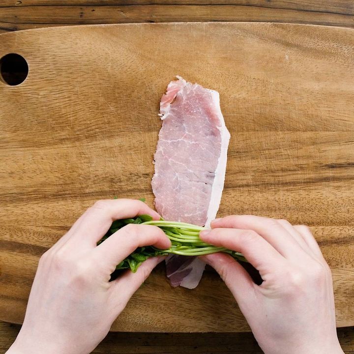 2: 豚ロース肉に豆苗をのせ、くるくると巻き付けます。味付塩こしょうをまんべんなくふりかけます。