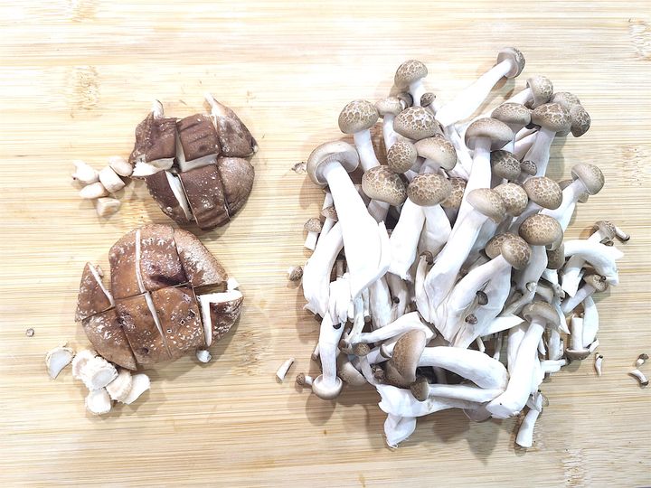 2.  しめじは石づきを切り落としバラバラに分けておき、しいたけは軸を切って大きめにカットします。軸は固めなので少し細かく切っておきます。