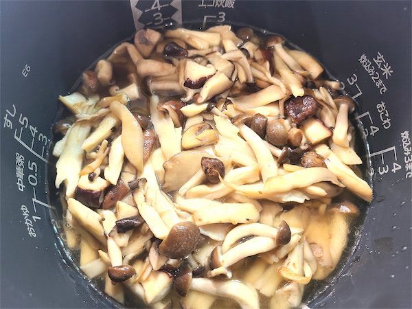 8.  6のきのこ類をのせたら混ぜずにならす程度で、通常の炊飯モードで炊飯します!